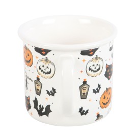 Stimmen Sie sich mit dieser Keramiktasse mit Vintage-inspirierten Halloween-Motiven wie schwarzen Katzen, Fledermäusen, Zaubertrankflaschen und Kürbislaternen auf Halloween ein.