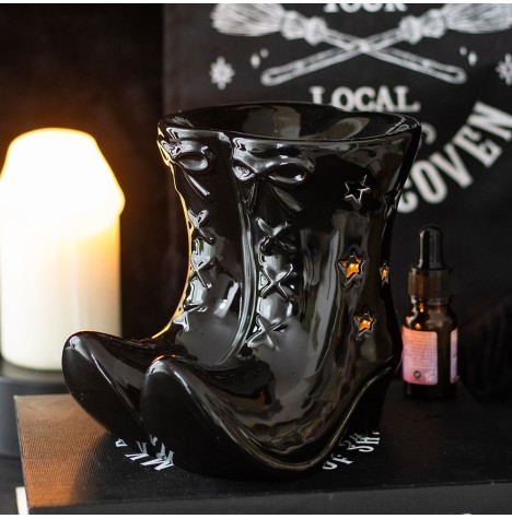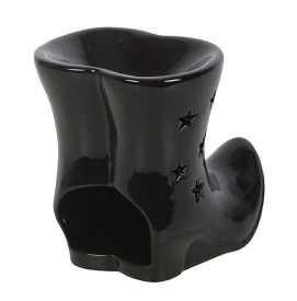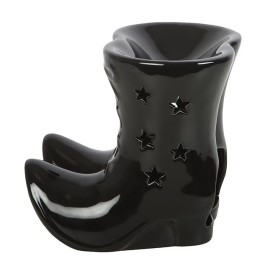 Verleihen Sie Ihrem Raum einen bezaubernden Touch mit dieser schwarzen Duftlampe in Form eines Paars klassischer Hexenstiefel, komplett mit Sternausschnitten, die bei Gebrauch leuchten. Stellen Sie einfach ein einzelnes Standard-Teelicht in den hinteren Bereich und geben Sie einfach das Duftwachs in die Schale, um den Raum mit Ihrem Lieblingsduft zu erfüllen. Ein lustiges und funktionales Stück für Zauberer, Fans von Gothic-Dekor oder alle, die einen Hauch von Magie lieben.