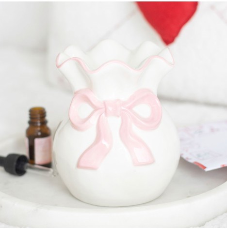 Diese süße Duftlampe mit einer zartrosa Schleife verleiht jedem Raum einen Hauch von Koketterie. Perfekt für den Valentinstag oder für alltägliche Duftmomente – einfach Duftwachs oder verdünntes Öl und ein Teelicht hinzufügen.
